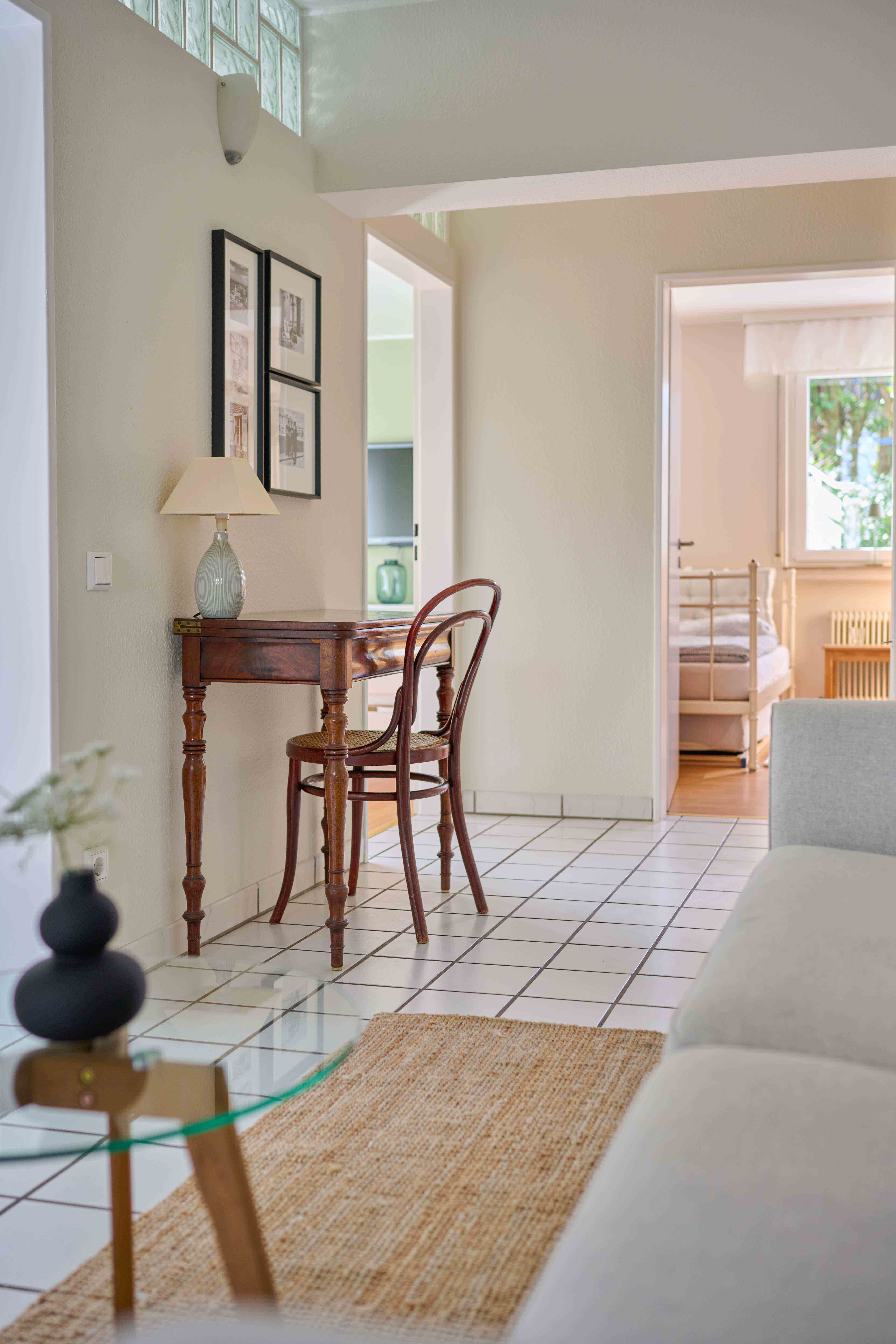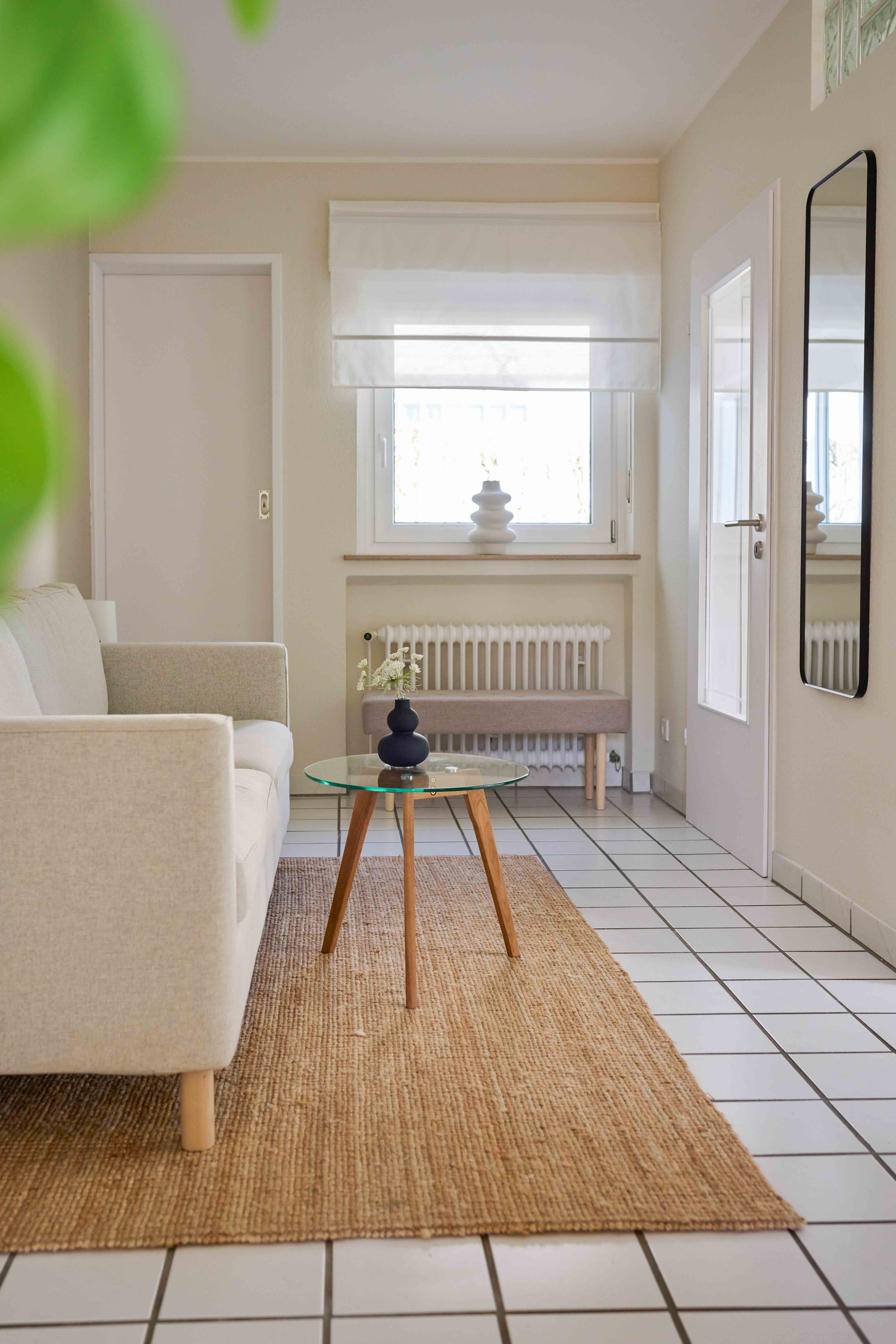 – einen Aufenthaltsbereich mit einer gemütlichen Couch und einer kleinen Sitzbank